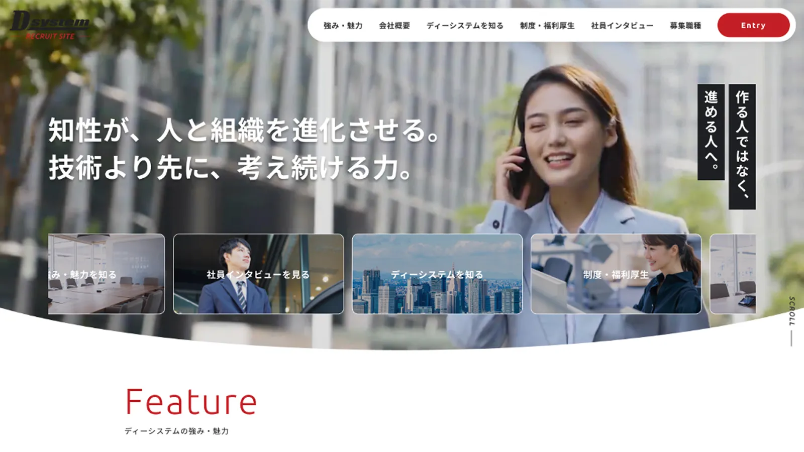 「赤と黒」の力強い配色はそのままに、女性社員が増えている背景を踏まえ、柔らかさも感じられるデザインを目指しました。赤の使いすぎを抑え、曲線的なデザインを取り入れることで全体の雰囲気を調整しています。メインビジュアルには動画を採用し、ゴシック体と手書きフォントを組み合わせることで、躍動感と温かみを表現しました。